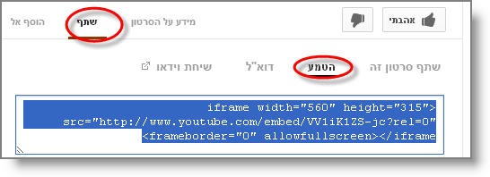 מתחת לסרטון לחצו על "שתף" ואז על "הטמע".